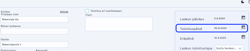 Huomaathan omassa laskutuksessa hyödyntää oikein uutta verokantaa. Oikea verokanta määräytyy pääsäännön mukaan tuotteen tai palvelun toimituspäivän mukaisesti. Jos olet siis toimittanut yleisen verokannan mukaisen tuotteen/palvelun 30.8.2024, mutta lähetät tästä laskun 2.9.2024, tulee laskulla käyttää alv-prosenttina vielä 24%. Laskutusohjelmistossamme tämä kerrotaan antamalla oikea toimituspäivä. Mikäli käytössä olevassa laskutusohjelmassasi ei ole tukea alv-muutokselle, meiltä saat käyttöösi laskutusohjelman, jolla voit helpottaa laskutuksen tekoa, maksujen seurantaa sekä ostolaskujen käsittelyä.